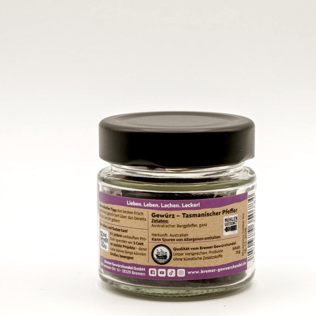 Unser tasmanischer Pfeffer ist ein wahres Naturprodukt – vegan, ohne Zusatz von Geschmacksverstärkern, ohne Zuckerzusatz und frei von Füllstoffen. Erlebe die einzigartige Kombination aus leichter Süße und kräftiger Schärfe, die Deine Gerichte in kulinarische Meisterwerke verwandelt. Ob in herzhaften Eintöpfen, edlen Saucen oder als besonderes Highlight auf gegrilltem Gemüse und Fleisch – tasmanischer Pfeffer verleiht jedem Gericht eine unverwechselbare Note.