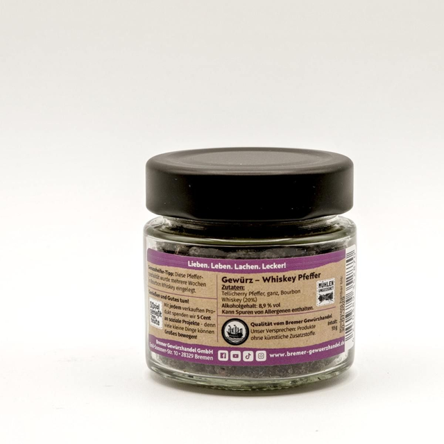 Erlebe die einzigartige Fusion aus kräftigem Telicherry Pfeffer und edlem Bourbon Whiskey. Unser Whiskey Pfeffer vereint die intensive Schärfe des Telicherry Pfeffers mit den feinen, holzigen Noten von Bourbon. Der Pfeffer wurde mehrere Wochen in Bourbon Whiskey eingelegt und enthält einen Alkoholgehalt von 8,9% Vol.